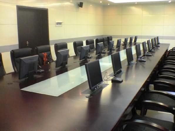 當(dāng)需要舉行會(huì)議時(shí)隱藏在會(huì)議桌內(nèi)的升降器把液晶顯示器從會(huì)議桌下面自動(dòng)升到桌面并仰成一定角度,